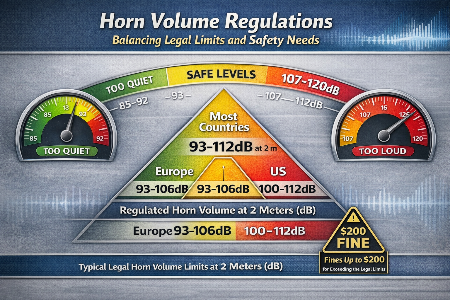 A horn that's too loud can get you fined, while one that's too quiet won't serve its purpose. Understanding these regulations ensures your horn meets both legal and safety requirements.