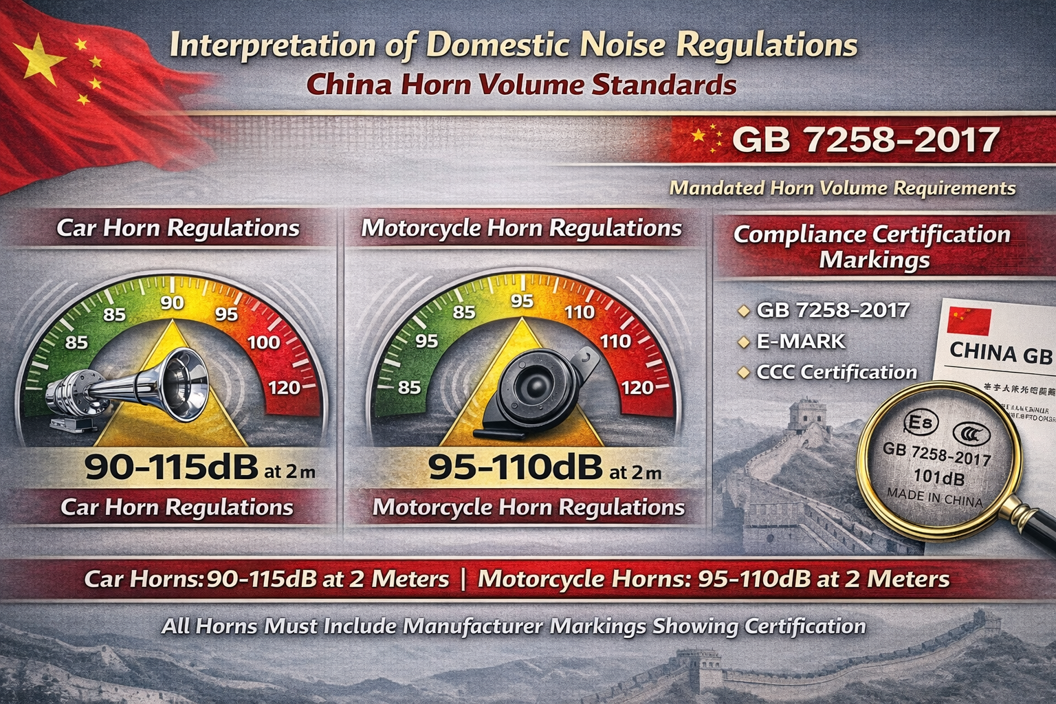 Chinese regulations mandate car horns measure 90-115dB at 2 meters frontally, with motorcycles limited to 95-110dB - all horns must include manufacturer markings showing compliance certification.