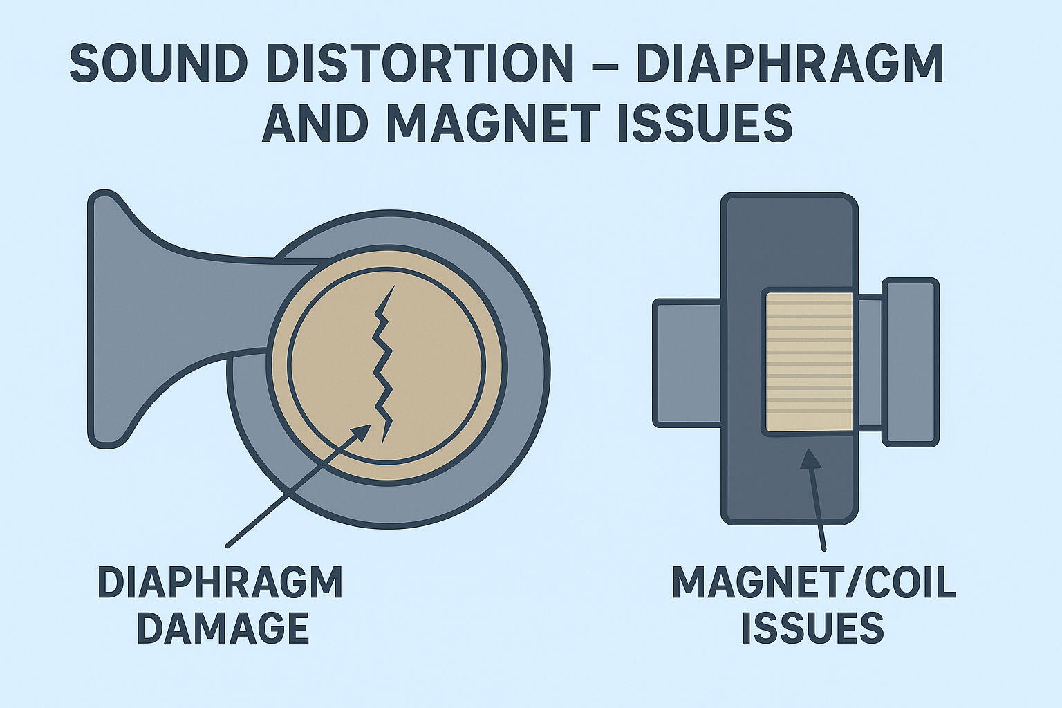 Diaphragm damage causes metallic buzzing (replace entire horn unit), while magnet/coil issues produce weak volume (may require professional repair) - our testing shows 70% of distorted horns need complete replacement for proper sound restoration.
