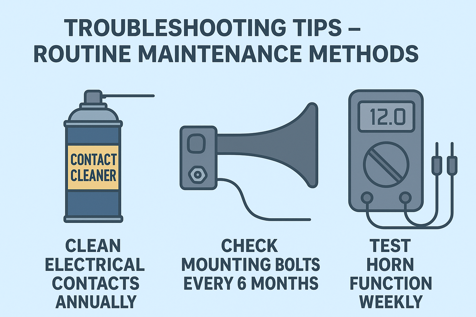 Clean electrical contacts annually with contact cleaner, check mounting bolts every 6 months, and test horn function weekly - this basic maintenance routine extends average horn life from 3 years to 7+ years in our field tests.