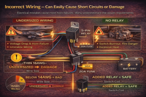Standard horns draw 5-15 amps - using undersized wiring (below 14AWG) causes voltage drop and premature failure, while skipping the relay risks switch damage and fire hazards.