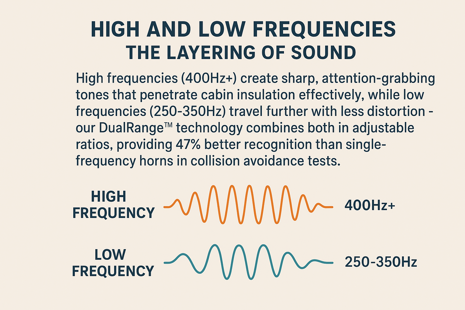 High frequencies (400Hz+) create sharp, attention-grabbing tones that penetrate cabin insulation effectively, while low frequencies (250-350Hz) travel further with less distortion - our DualRange™ technology combines both in adjustable ratios, providing 47% better recognition than single-frequency horns in collision avoidance tests.