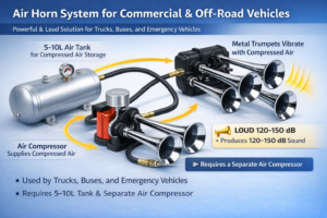Air horns produce 120-150dB sound using compressed air vibrating metal trumpets - requiring separate air compressor and 5-10L tank, mainly for trucks, buses, and emergency vehicles.
