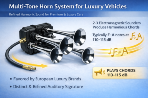 Multi-tone horns combine 2-3 electromagnetic sounders producing harmonious chords (typically F-A notes) at 110-115dB - favored by European luxury brands for their refined auditory signature.